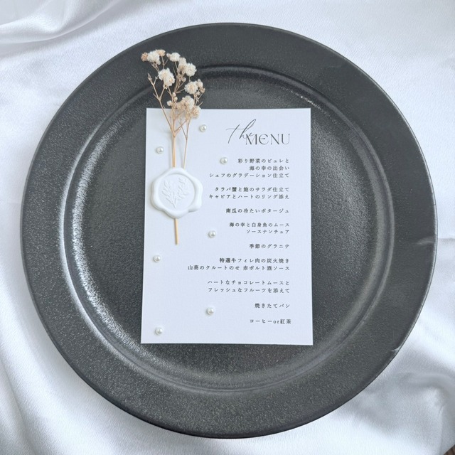 こちらの商品をオーダーご希望の方はご購入はせずに先にお問い合わせよりお願いいたします。 ・ご希望の仕様①〜③ ・ご希望のサイズ①か② ・ご希望の枚数 ・用紙 ・使用日 こちらを一緒に記入してお問い合わせをお願いいたします。 - 熊neko.designshopオリジナル✧ お洒落で可愛いトレンド感たっぷりのメニュー表です♪ 完成品で届くので少しでも結婚式の準備を楽にお洒落に♡ 当店は紙専門店からセレクトした高級紙や厚紙のみで制作しておりますので大切なゲスト様に質のよいペーパーアイテムでおもてなしができます。 加工・装飾オプションが豊富なのでオリジナルのペーパーアイテムの制作が可能です。 - ▶キャンセルについて https://kumaneko.base.shop/items/110073739 ▶通常納期より急ぎでの制作ご希望の場合は+料金となります https://kumaneko.base.shop/items/41494520 ▶インスタから過去の作品がご覧頂けます。 https://www.instagram.com/kumaneko.weddingshop - ◆通常納期 ・到着希望日まで3週間以上 70部以上は納期延長を1-7日頂いております。 年末年始、GW、お盆時期を挟む場合や前後は納期にご注意下さい。 使用日の1週間前には到着するよう納期は計算されて下さい。 ◆注文からお届けまで ①お問合せ後にお見積り→ご購入となります ②やりとりはLINEかアドレスにて行います ③記載内容を〈2日以内〉にご提示 ④データ画像制作 (平日3日以内) ⑤お客様による確認 ⑥印刷と加工 (平日7日以内) ⑦完成後 3日以内に発送予定 ⑧2-3日でお手元に届きます - ◆用紙 取り扱い用紙についてはこちら→https://kumaneko.base.shop/items/119422270 ※サンプルはキラキラ紙①を使用 ◆印刷・装飾オプション リボンについてはこちら→https://kumaneko.base.shop/items/119422440 加工や装飾オプションについてはこちら→https://kumaneko.base.shop/items/127377931 ◆金額 (ご希望の仕様) ①パールシールのみ 160円 ②パールシールとドライフラワーと木クリップ付き 220円 ③パールシールとドライフラワーとワックスシール 250円 ※30枚〜ご注文いただけます。 ※ドライフラワーは繊細な為、梱包や配送時に多少取れたりする事がありますが自然素材の為予めご了承下さいませ。少し多めに予備はお入れします。 ◆サイズ ①99×210㎜ ②105×148㎜ ◆メニュー内容 英語、フランス語などはお客様にて調べてのご提示をお願いいたします。 ◆その他 ・訂正3回まで無料となります。 ・以降訂正1回毎に+1000円。 ・フォント、カラー、文章、背景などの見比べは訂正1回消化になります。 ◆よくある質問 ・紙の見本を直接手で触って確認したいです。 →サンプルについてはこちらから https://kumaneko.base.shop/items/101675272 ・アレルギーやお子様メニューは制作可能でしょうか? →当店ではデザイン同じに限り追加料金はかからず制作しております。 ・発送後に追加が出た場合はどうすれば良いでしょうか? →ご希望の追加枚数+送料ご負担で追加が可能ですが、納期がギリギリの場合はお急ぎ料金がかかる場合ございます。 ・販売されていないデザインも制作可能でしょうか? →デザイン料1作品に付き1000円〜可能です。お見積りいたしますのでイメージ画像などと合わせてお問い合わせ下さい。 - ◆注意点 ・ウェディング関連のペーパーアイテムは印刷からカット工程、梱包作業など1枚1枚手作業にて制作しております。3㎜以内の差やズレは手直し範囲外となります。 ・ゲスト名やメニュー内容は画像提出ではなく文字をコピーできるテキスト提出にてご提示下さい。 ・お名前やメニュー内容など間違えがないか必ず新郎新婦様以外の方にも確認をしていただいて下さい。印刷後の間違えは通常金額の追加購入での対応となりますのでご注意下さい。 ・記載内容は2日以内にご提示下さい。ご準備が遅くなったり、増やしたいから待って欲しい場合は、納期によってはお急ぎ料金がかかる場合がございます。 ・当店にてサイトからフォントなどのダウンロードをご希望の場合は無料サイトのみ可能です。登録が必要なサイトはお断り致しますが当店がすでに登録しているサイトもあるのでご相談下さい。 ・持ち込み画像やフォントの著作権については当店では一切関与しておりません。 ・お使いのモニターによっては印刷との色彩が多少変わる場合がございます。なるべく画像に似せてお作りしておりますが、鮮やかな画面をインク印刷で再現するには限界がございますので予めご了承下さいませ。 ・制作データは使用日から半年は残しておきますので何かありましたらそれまでにご連絡をお願い致します。 ・制作に入ってからのキャンセル、返金は一切行っておりません。 ・その他、記載にない詳細がある場合はその都度お伝えする場合がございます。