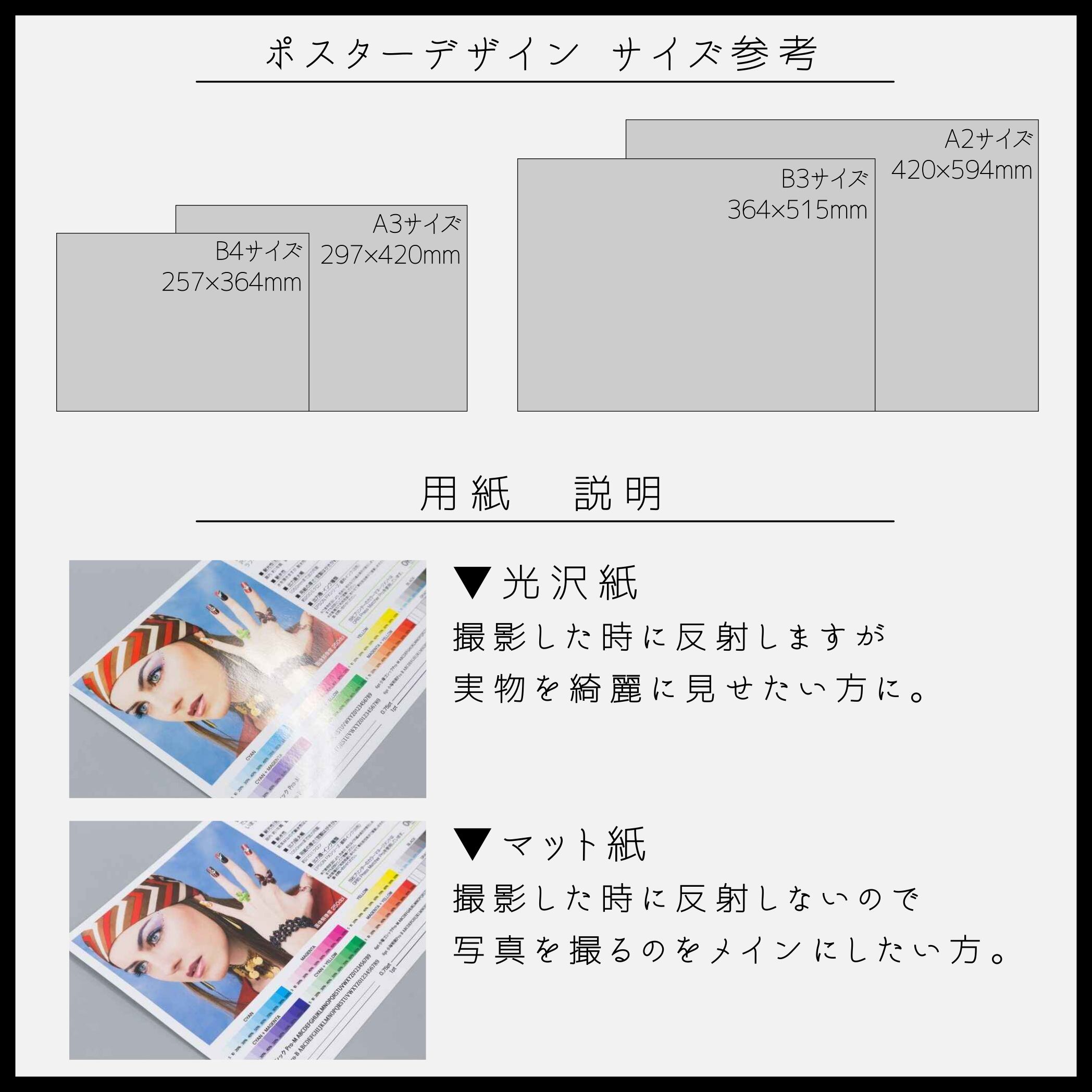 ・光沢紙→撮影した時に反射しますが実物を綺麗に見せたい方に。